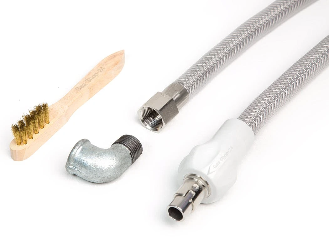 Allgas Sicherheits-Gasschlauch 1,5 m aus Edelstahl (für Gassteckdose) + Gas-Anschlusswinkel 1/2″ + Reinigungsbürste aus Messing