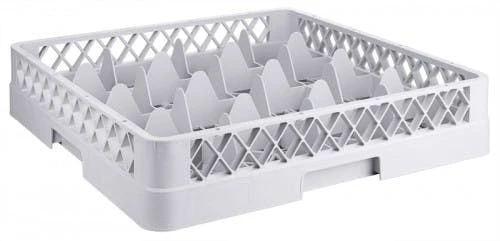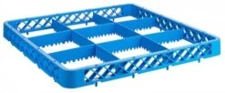 Geschirrspülkorb GLAS/TASSE mit Facheinteilung aus hellgrauem Polypropylen, DIN 66075-F (50 x 50 cm), stapelbar, hitzeresistent bis +120°C, durch blaue Aufsätze lässt sich die Nutzhöhe um jeweils 4 cm erweitern
