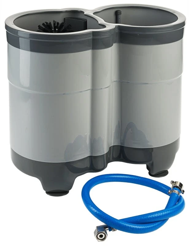 Gläserspülgerät, mit getrennter Vor- und Nachspülung, zwei Wassersperrventile, integriertes belüftetes Rückschlagventil, abnehmbarer Gehäuseboden, mit geschlossener Nachspülung, Innenbürste durch Bajonettverschluss schnell zu lösen, für alle gängigen Gläsersorten geeignet, auch für Weizenbier- und 1 l-Henkelgläser